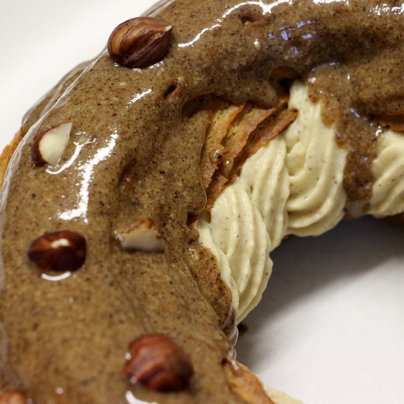 Un Paris Brest à ma façon, pour les amoureux de la noisette. Ici du coulant, du fondant, du croquant et du croustillant, avec de la noisette à tous les étages.